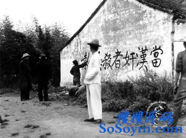 尽管如此,对于投敌叛国的汉奸,民众仍是深恶痛绝,照片中的民众正在路边书写“当汉奸者杀无赦”的标语。