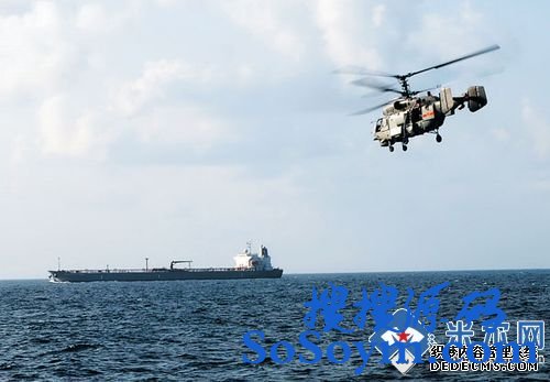 资料图:中国护航舰载直升机在“宇善”号商船上空巡逻警戒。钱晓虎摄